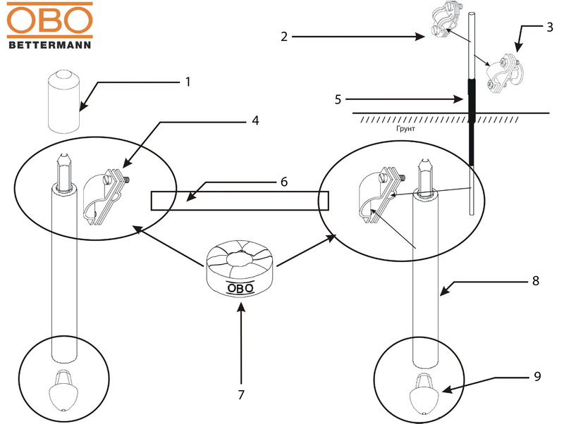 1. Насадка для забивання шпильки заземлення; 2. З'єднувач; 3. Тримач; 4. З'єднувач; 5. Штанга заземлення; 6. Смуга оцинкована; 7. Стрічка антикорозійна; 8. Шпилька заземлення; 9. Насадка нижня.